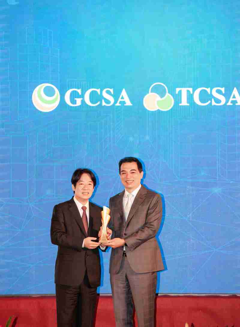 达全方位永续表现获全球永续奖及台湾永续奖肯定,,由副总统赖清德颁奖 (左),,,PG国际总经理柯富仁 (右) 代表领奖